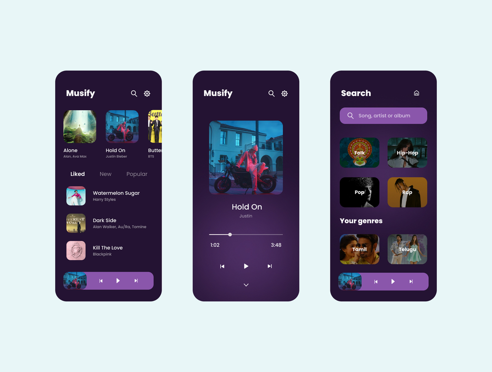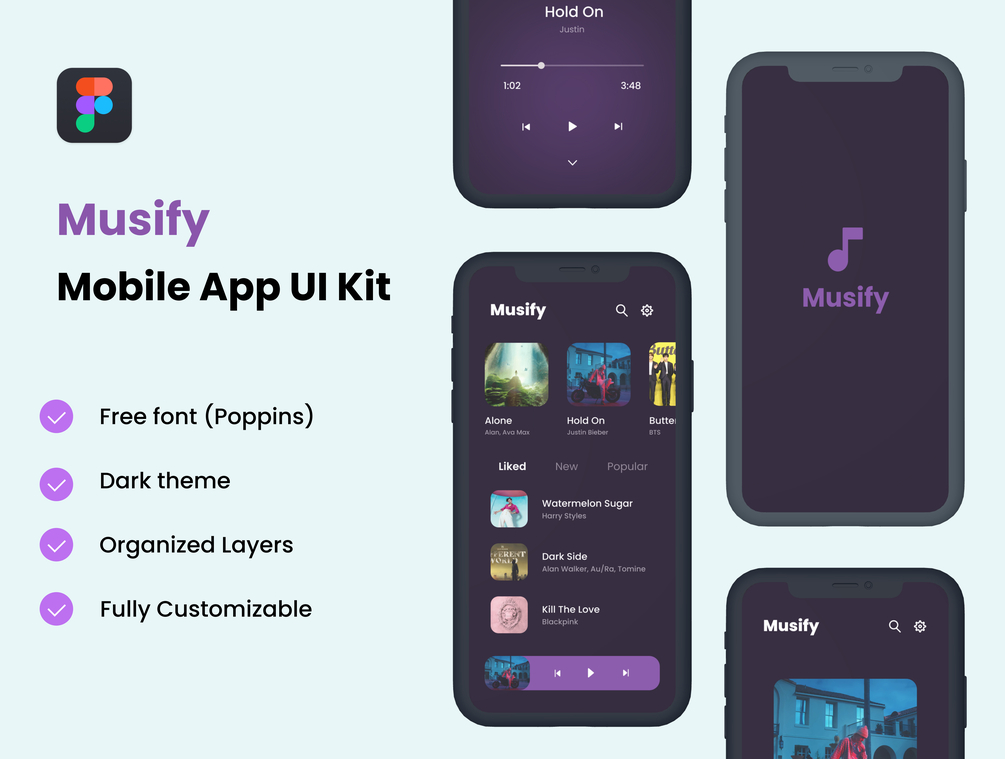 This Music App UI Kit is designed exclusively for FIGMA. This kit features fully-customizable components, including UI elements, colours. typography.